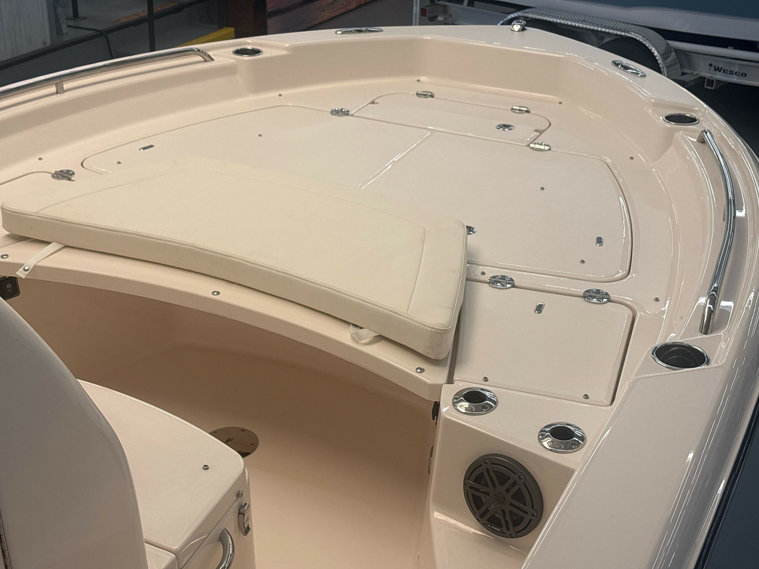 Console Accessory Outlet – 12V (2) Compass Drink Holders – Stainless Steel (2) Fish box – 29-qt. (27 l) Insulated Storage box Under Forward Console Seat Flush Mount Electronics Area Head – Lockable Console w/Portable Head, Stand up Head Area, Indirect Lighting, Bulk Storage & Composite Cherry & Holy Sole