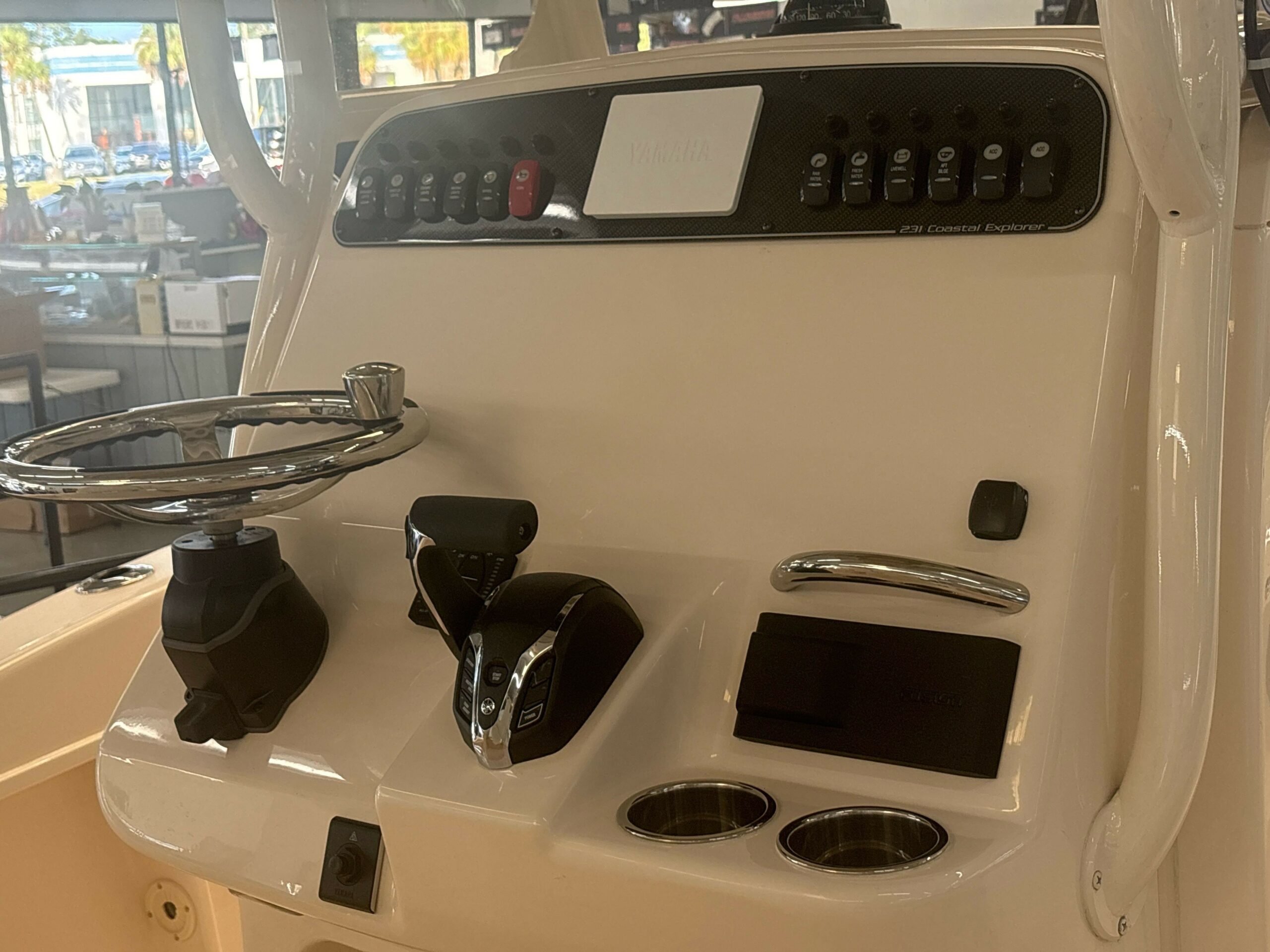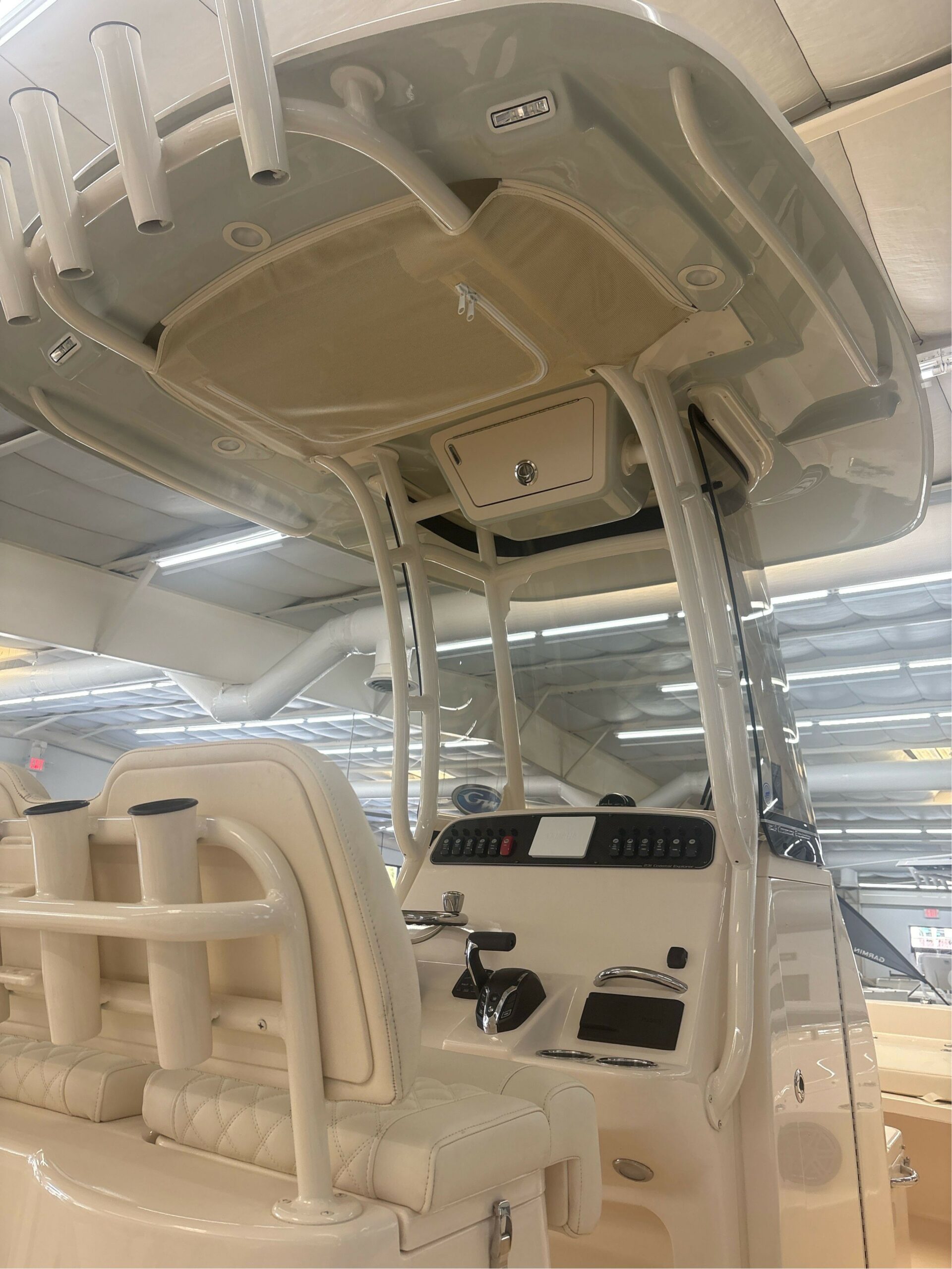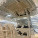 Seating – Molded Forward Console Seat w/Cushion & Backrest Steering – Hydraulic Tilt Steering Wheel – 316 Grade Stainless Steel w/Knob T-Top – Fiberglass w/Painted Aluminum Frame, Storage net, LED Spreader Lights, Rod Holders (4), tri-Colored (Red, Blue, White) LED Recessed Lights (3) & Radar Flat Window – Opening Window w/Screen Windshield – Scratch Resistant Acrylic Integrated w/T-Top