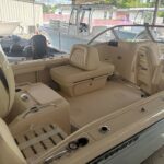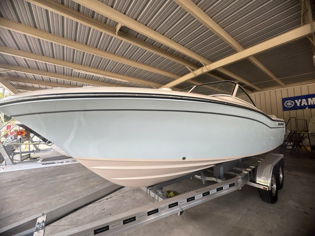Seating – Port & Starboard Bow Cushioned Seating Steering – Hydraulic Tilt Steering Wheel – 316 Grade Stainless Steel w/Knob Stereo System w/Waterproof Touch Screen Display, AM/FM Tuner, Wi-Fi & Bluetooth Connectivity & Remote Unit; Speakers – Bow (2), Helm (2) Stern Eyes – 316 Grade Stainless Steel Storage – Aft Lift Out Boxes (2) Storage – Forward Anchor Locker w/Rode Storage Storage – Lockable Starboard Console Compartment w/Light & Storage Pocket w/Tackle Trays (2) Swim Platforms – Aft Port & Starboard Extensions w/Starboard Ladder Vista Top w/Front, Side Curtains & Boot (Black) Windshield – Walk-Through Tempered Glass Windshield Wiper (Starboard)