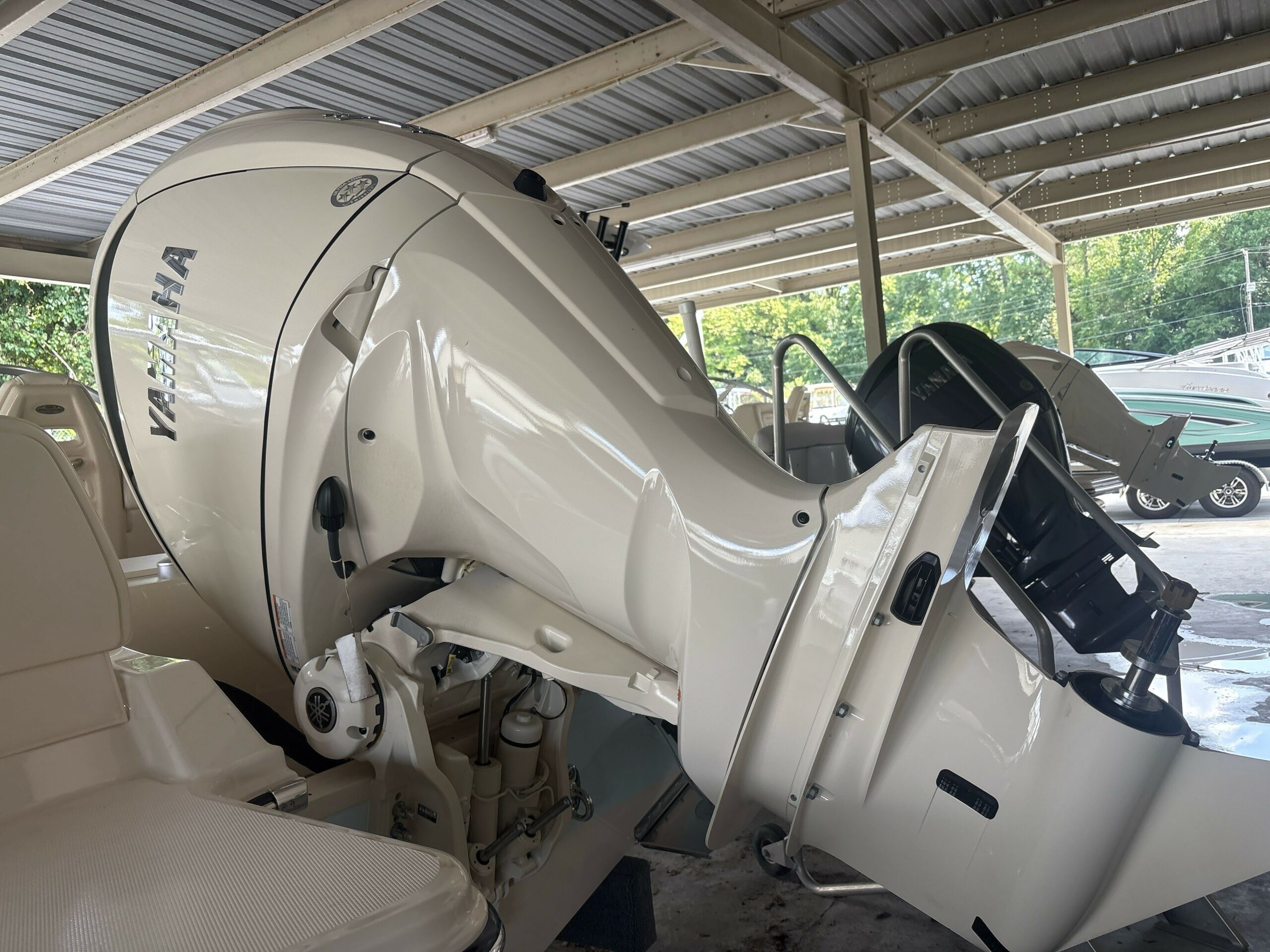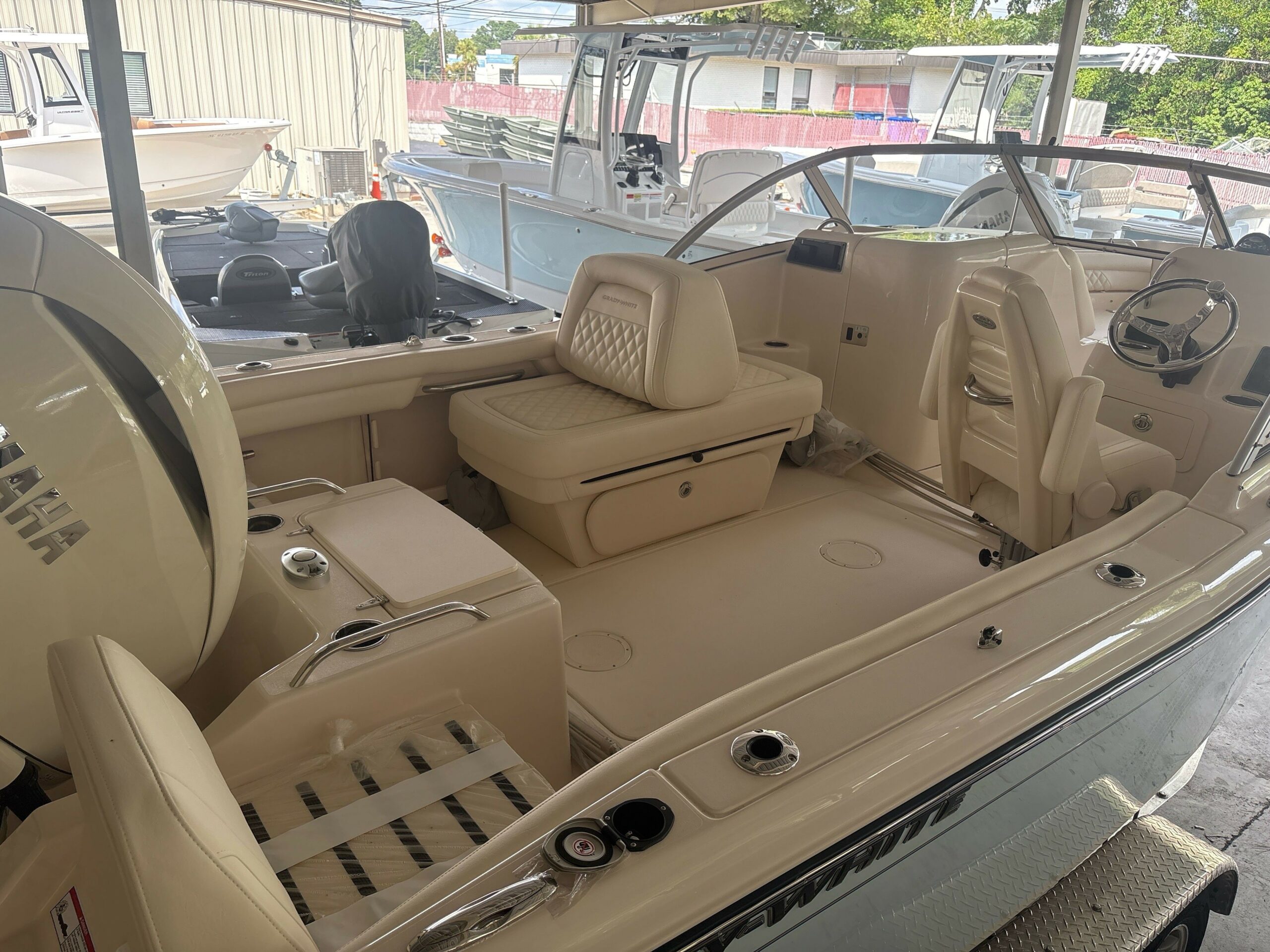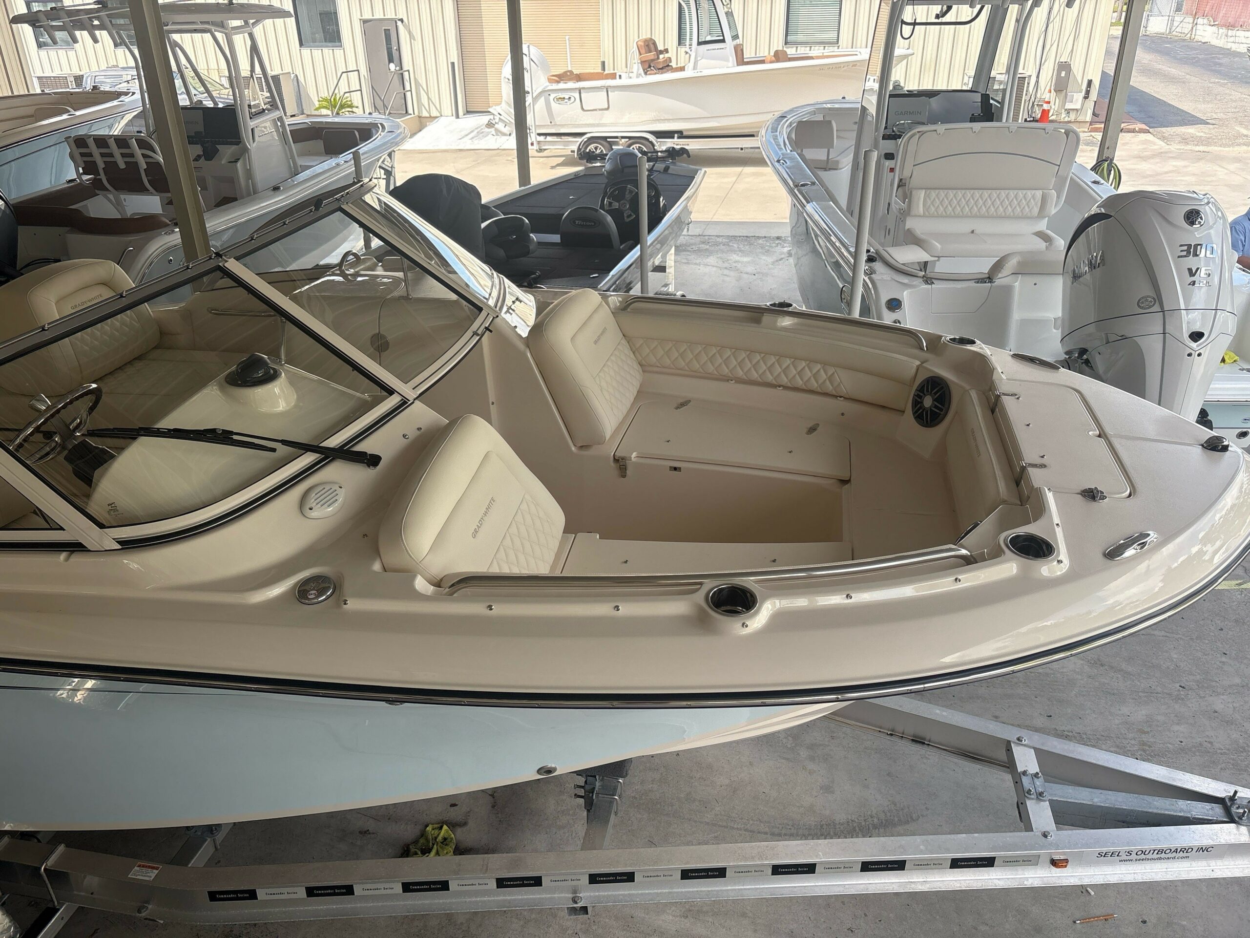Companion Grab Rail Compass Cooler – 64-qt. (60 l) Aft Insulated Cooler Deck Hardware – 316 Grade Stainless Steel Through-Bolted Drink Holders – Stainless Steel (9) Engine Flush System w/Hose Attachment Aft Factory Engine pre-Rigging Fish/ice Boxes – 56-qt. (53 l) Port & Starboard Bow Insulated Boxes w/ob Drain Flush Mount Electronics Area Forward Bolsters Head – Lockable Port Console Area w/Lighting, Portable Head, Mirror, Storage & Composite Cherry & Holy Sole Hydraulic Trim Tabs w/Indicator & Retractor